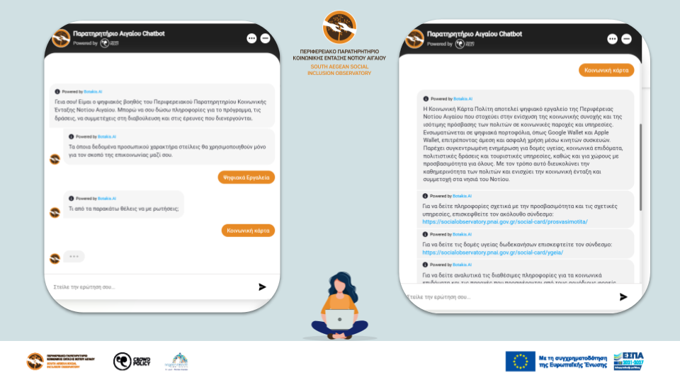 Παράλληλα, ο ψηφιακός βοηθός του Παρατηρητηρίου ανανεώθηκε αξιοποιώντας τεχνολογίες Generative AI, προσφέροντας πιο εξελιγμένη, άμεση και εξατομικευμένη πληροφόρηση στους χρήστες. Η νέα του εκδοχή επιτρέπει την καλύτερη κατανόηση των ερωτημάτων των πολιτών και την παροχή πιο στοχευμένων απαντήσεων, ενισχύοντας τη χρηστικότητα των ψηφιακών υπηρεσιών και βελτιώνοντας συνολικά την εμπειρία αλληλεπίδρασης με το Παρατηρητήριο.