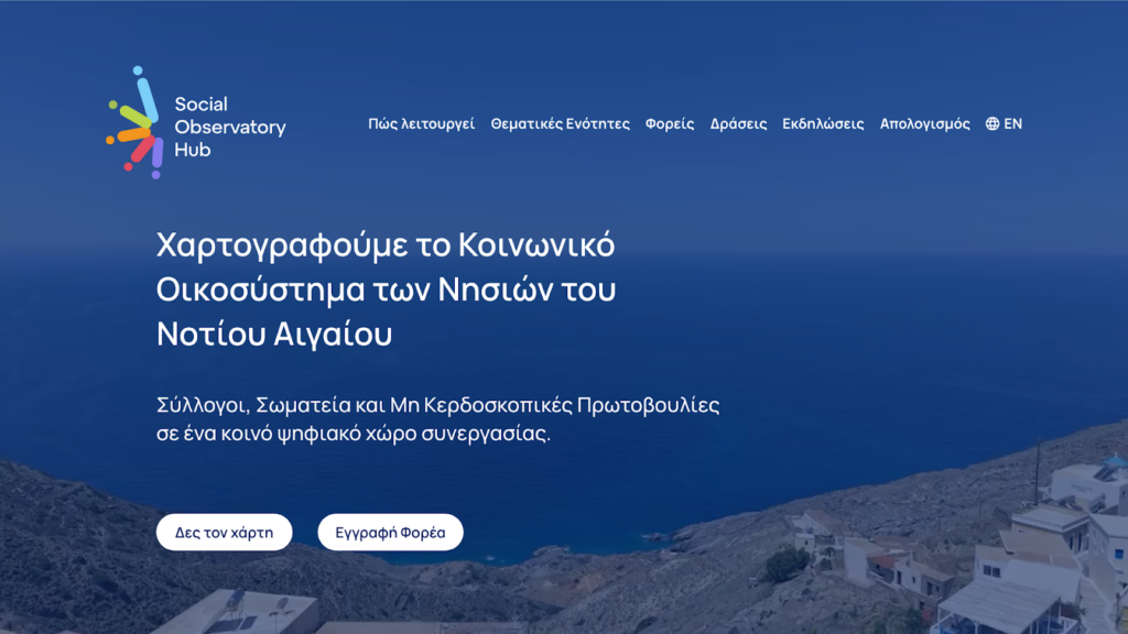 Παράλληλα με τις δράσεις διαλόγου, το Παρατηρητήριο επενδύει συστηματικά στην ανάπτυξη ψηφιακών εργαλείων που ενισχύουν τη διασύνδεση και τη συμμετοχή των πολιτών. Στο πλαίσιο αυτό, αναπτύσσεται το Κοινωνικό Οικοσύστημα, μια νέα ψηφιακή πλατφόρμα που συγκεντρώνει συλλόγους, σωματεία, ΜΚΟ, ΚοινΣΕπ και οργανώσεις της Κοινωνίας των Πολιτών στο Νότιο Αιγαίο.